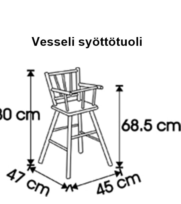 Kotimainen Vesseli syöttötuoli on perinteinen, puinen syöttötuoli. Syöttötuolin valmistusmateriaalina on käytetty kestävää koivua. Syöttötuoli on tilattavissa istuinpehmusteella tai ilman. Toimitus koottuna.