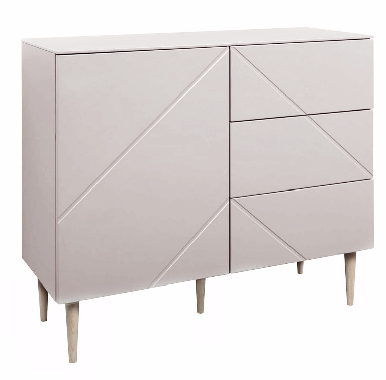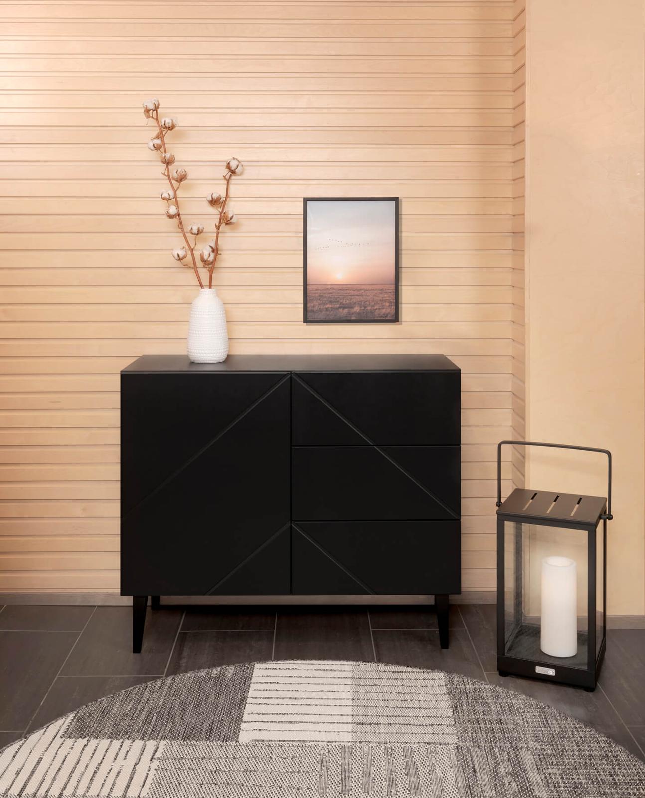 Vasemman puolen kaappi korkeussäädettävällä hyllyllä ja oikean puolen kolme laatikkoa tarjoavat runsaasti käytännöllistä säilytystilaa. Toimiva rakenne tekee lipastokaapista täydellisen valinnan niin olohuoneeseen, eteiseen kuin makuuhuoneeseenkin.
