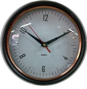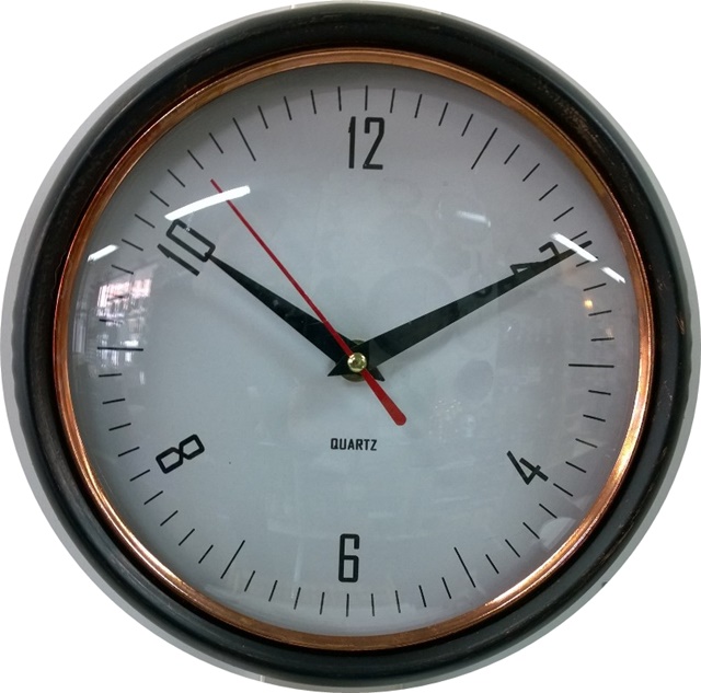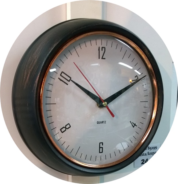 Kestävä lasinen kellotaulu ja vanhan tyyliseksi viimeistelty metallireuna luovat kelloon aidon vintage-henkisen vaikutelman. Mattamusta väritys ja kuparinen koristerengas tuovat kokonaisuuteen hienostunutta kontrastia ja sopivat moniin sisustustyyleihin.