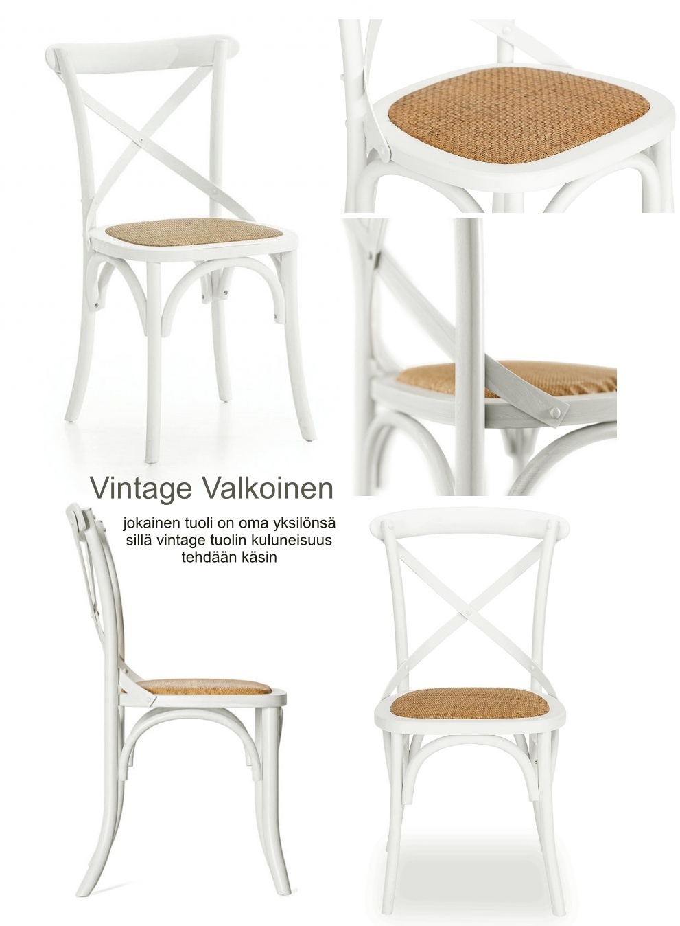 Ergonominen muotoilu, rottingin alle sijoitettu tukeva vaneri sekä massiivipuun luonnollinen kestävyys takaavat miellyttävän istumakokemuksen. Materiaalin luonteeseen kuuluvat pienet epätasaisuudet ja jäljet korostavat tuolin aitoa vintage-ilmettä, tehden jokaisesta kappaleesta uniikin.