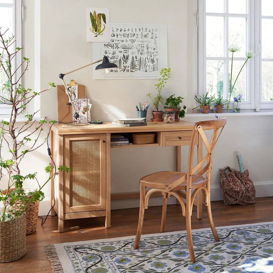 Valittavissa elegantti valkoinen kulutetulla pinnalla, luonnollisen lämmin tammi tai dramaattisen tyylikäs musta. Kaikissa versioissa rottinki ja runko sointuvat kauniisti yhteen, mikä mahdollistaa helpon yhdistelyn kodin muihin huonekaluihin.