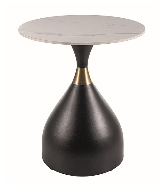 Pyöreä valkoinen marmorikuvioitu keramiikkakansi tarjoaa sekä näyttävyyttä että helppohoitoisuutta, tehden pöydästä erinomaisen valinnan niin laskutasoksi kuin koriste-esineiden esillepanoon. Kompakti koko – halkaisija 50 cm ja korkeus 57 cm – varmistaa, että pöytä sopii täydellisesti myös pienempiin tiloihin ilman kompromisseja toiminnallisuudessa.