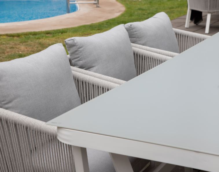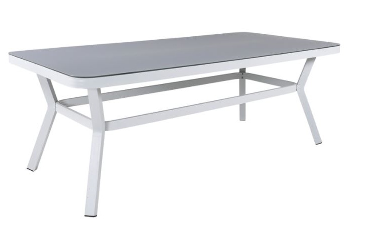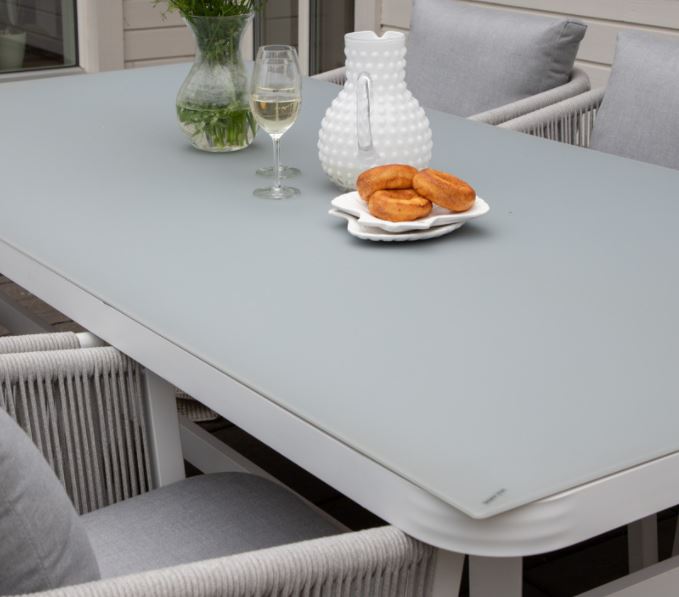Virya-sarjan vankka ruokapöytä, jossa tilaa koko perheelle. Pöytälevy on valmistettu lasista ja jalusta valkoisesta alumiinista. Ulkokäyttöön tarkoitettu ruokapöytä, joka luo upean tunnelman ulkotilaasi. Nauti kesäisistä illallisista yhdessä perheen tai ystävien kanssa! Alumiinista ja ruostumattomasta teräksestä valmistetut ulkokalusteet tulee puhdistaa säännöllisesti vedellä ja miedolla saippualla.