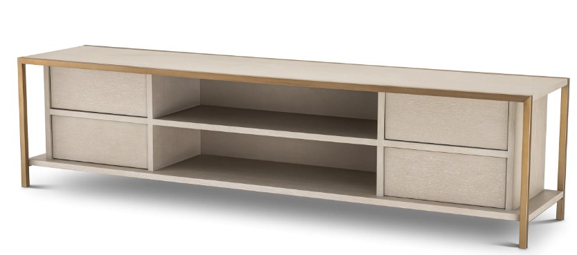 Wilmot TV-taso tuo olohuoneeseesi suoralinjaisen, modernin estetiikan, jota korostavat elegantit teräsreunukset ja vaalea pesty tammiviilu. Harjatun messingin yksityiskohdat tuovat kokonaisuuteen hienostuneen viimeistelyn, joka sopii täydellisesti nykyisiin sisustustrendeihin.