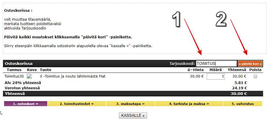 Tilaa tuote ja mene kassaan ja kirjoita kassassa ostoskorissa kuponkikoodikohtaan TOIMITUS (katso kuva, kohta 1) ja sen jälkeen päivitä ostoskori klikkaamalla nappulaa päivitä kori kohta 2.