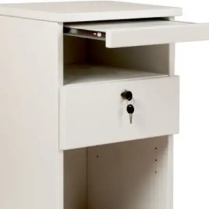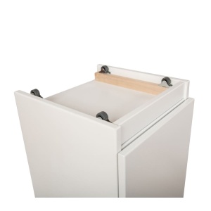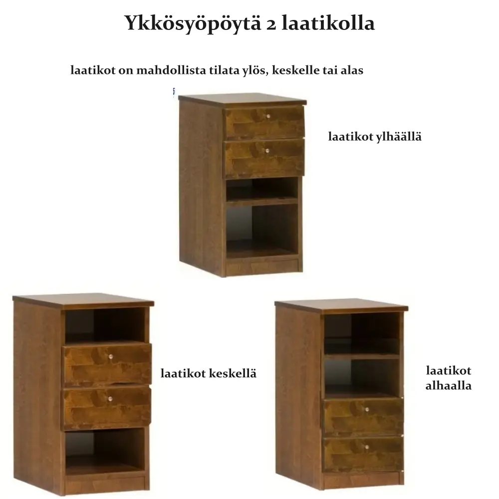 Kaksi laatikkoa tarjoavat runsaasti säilytystilaa, ja halutessasi ylimmän laatikon voi varustaa kätevällä lukolla tärkeiden esineiden turvaamiseksi. Voit valita laatikoiden sijoittelun, värin sekä lisävarusteet, kuten pyörät tai käytännöllisen vetotason – näin yöpöytä mukautuu juuri sinun arkeesi.